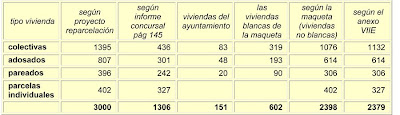 La primera columna, la de las 3000 viviendas, "va a misa", porque son cifras tomadas del proyecto de reparcelación. La segunda de las columnas es decepcionante como dato, figura en la página 145 del informe concursal como las viviendas de las que consta nuestra urbanización, y no puede ser cierta, o no sé lo que esa página quiere decir.
